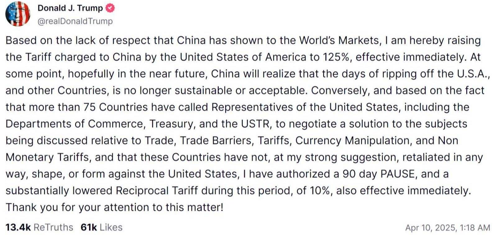 Not only is Trump quick to mount his assaults, he is equally rapid in retreating, hence today’s latest round of 90-day suspension reversal: